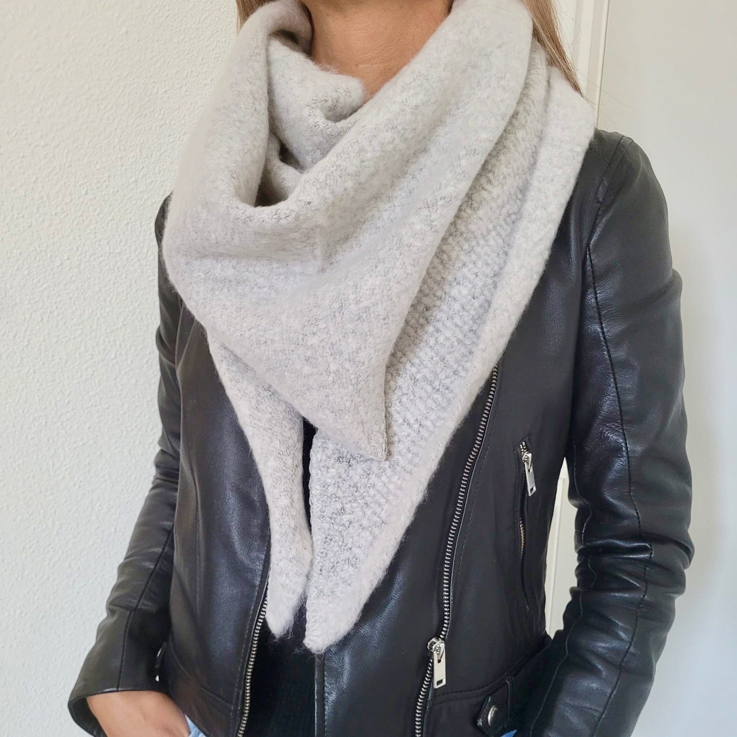 Prachtige zeer zachte lichtgrijze sjaal in een driehoek vorm. De sjaal kan op verschillende manieren gedragen worden en tevens als omslagdoek gebruikt worden!