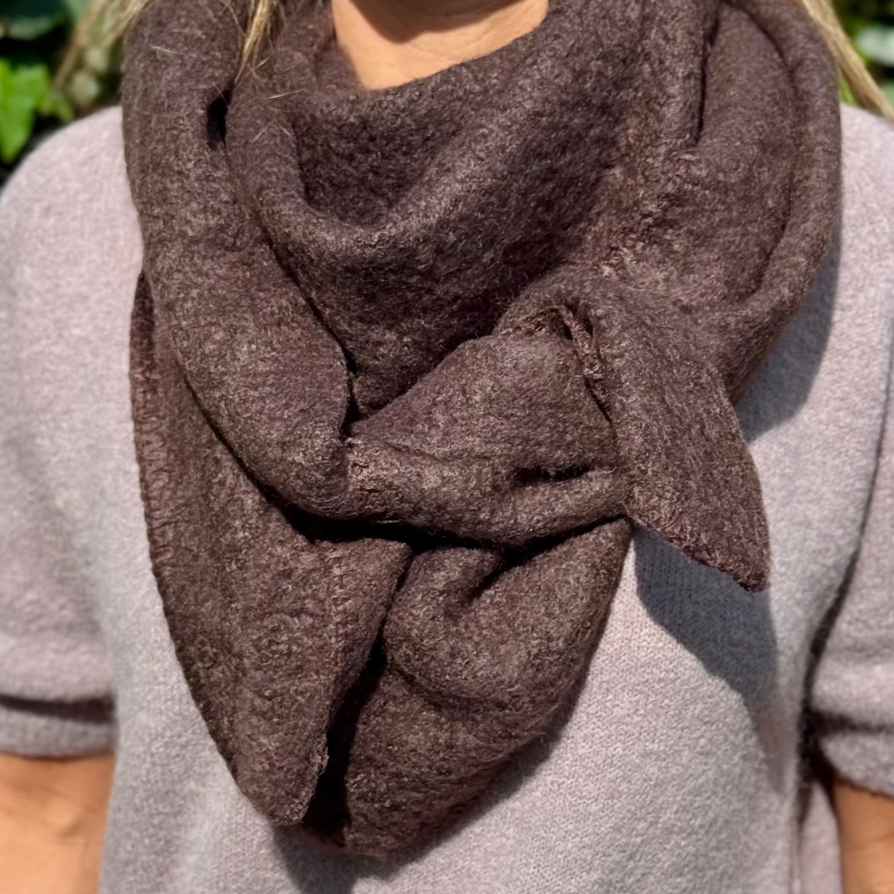 Prachtige zeer zachte donkerbruine sjaal in een driehoek vorm. De sjaal kan op verschillende manieren gedragen worden en tevens als omslagdoek gebruikt worden!