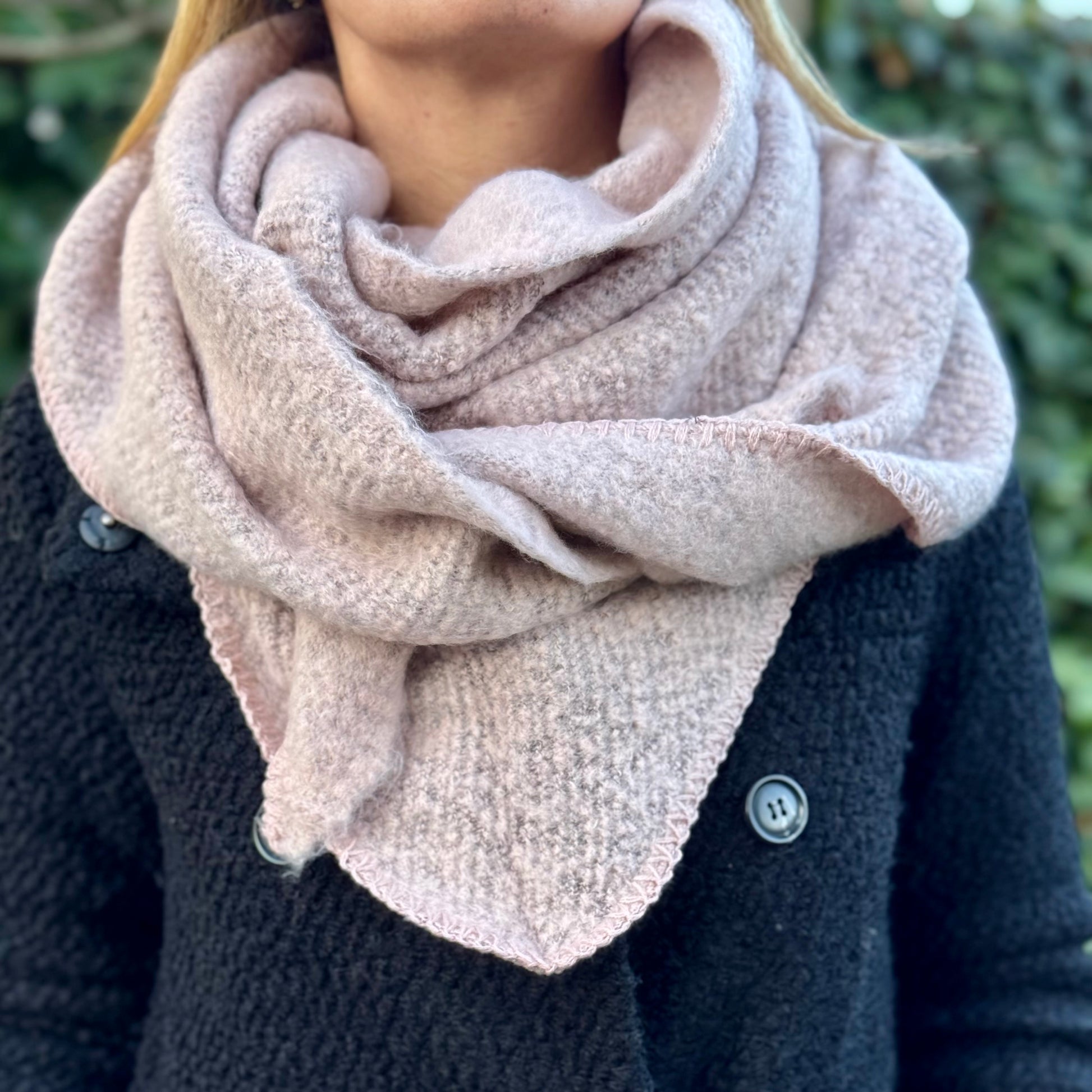 Prachtige zeer zachte lichtroze sjaal in een driehoek vorm. De sjaal kan op verschillende manieren gedragen worden en tevens als omslagdoek gebruikt worden!