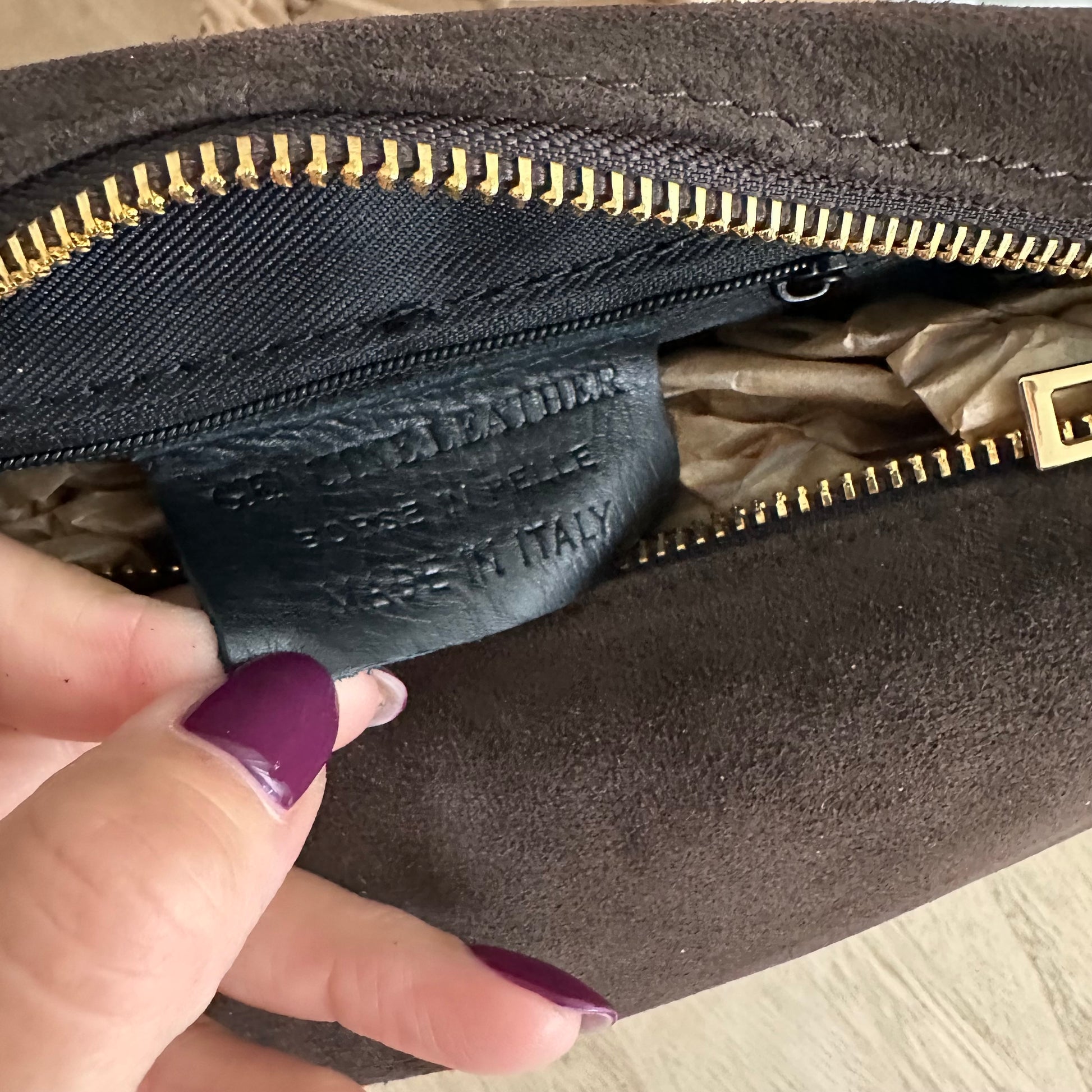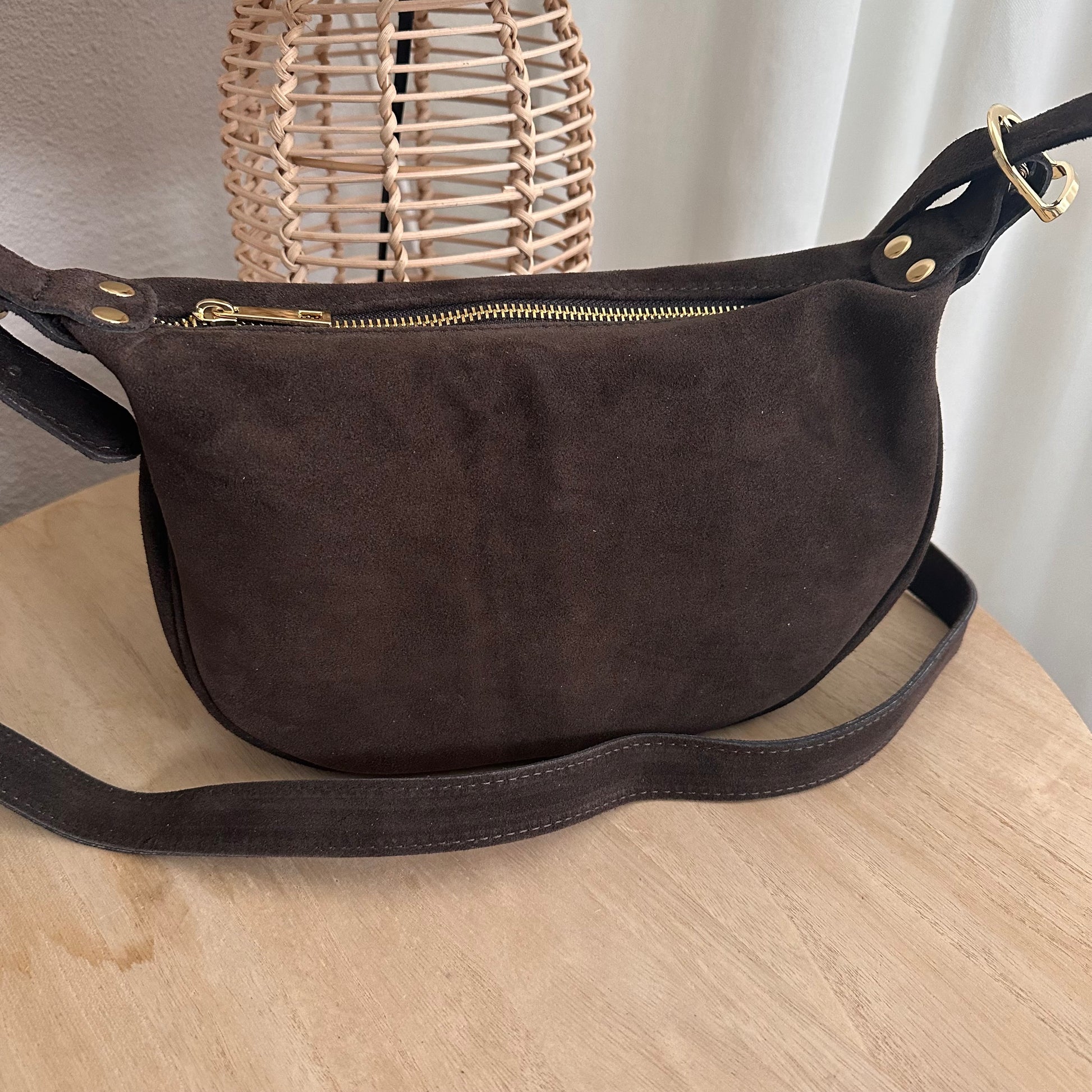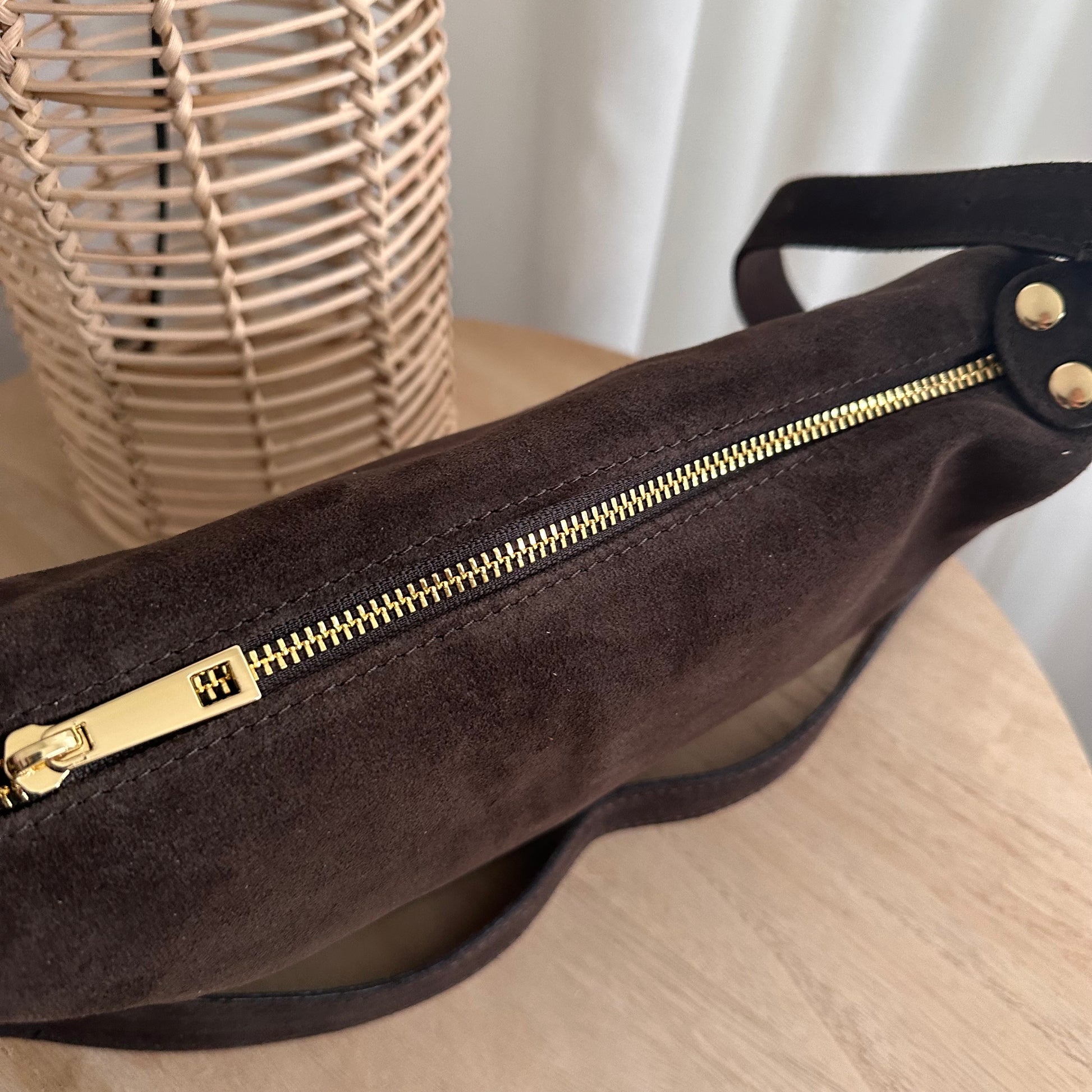 Stijlvolle schoudertas door zijn eenvoud. Warme chocobruine kleur. De tas heeft een groot middenvak met gouden rits en aan de zijkant een zijvakje dat sluit middels een rits.