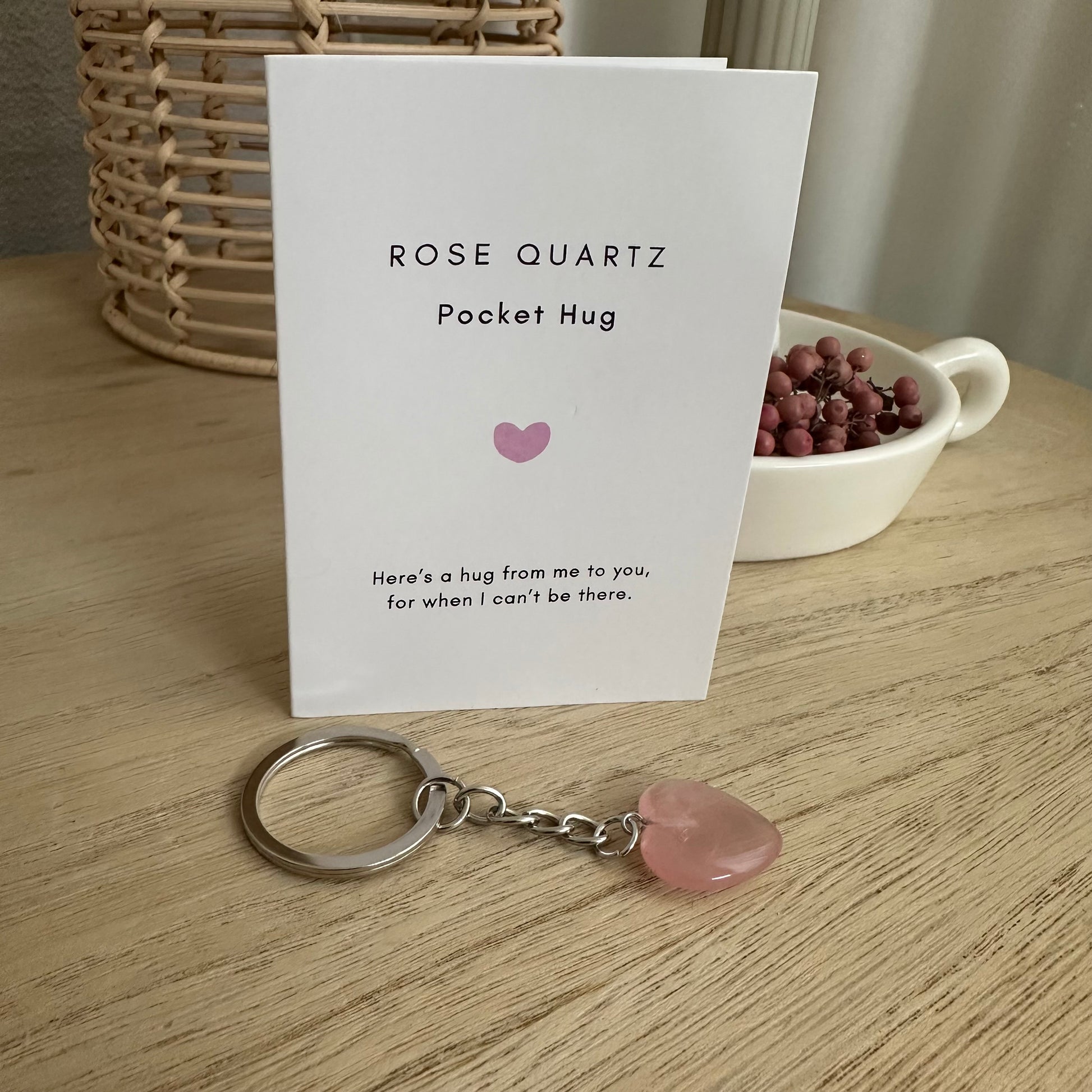 Dubbel kaartje met inspirerende tekst en Rosé Quartz steentje aan sleutelhanger in de vorm van een hartje.