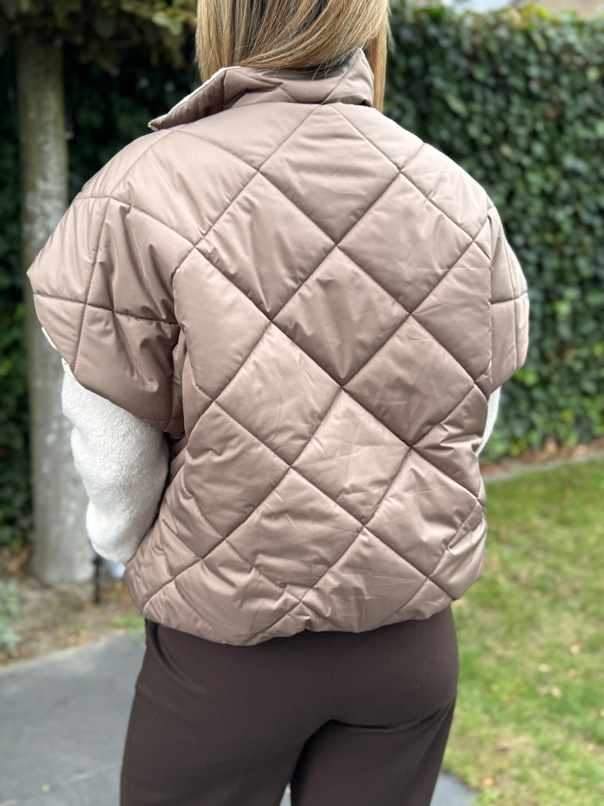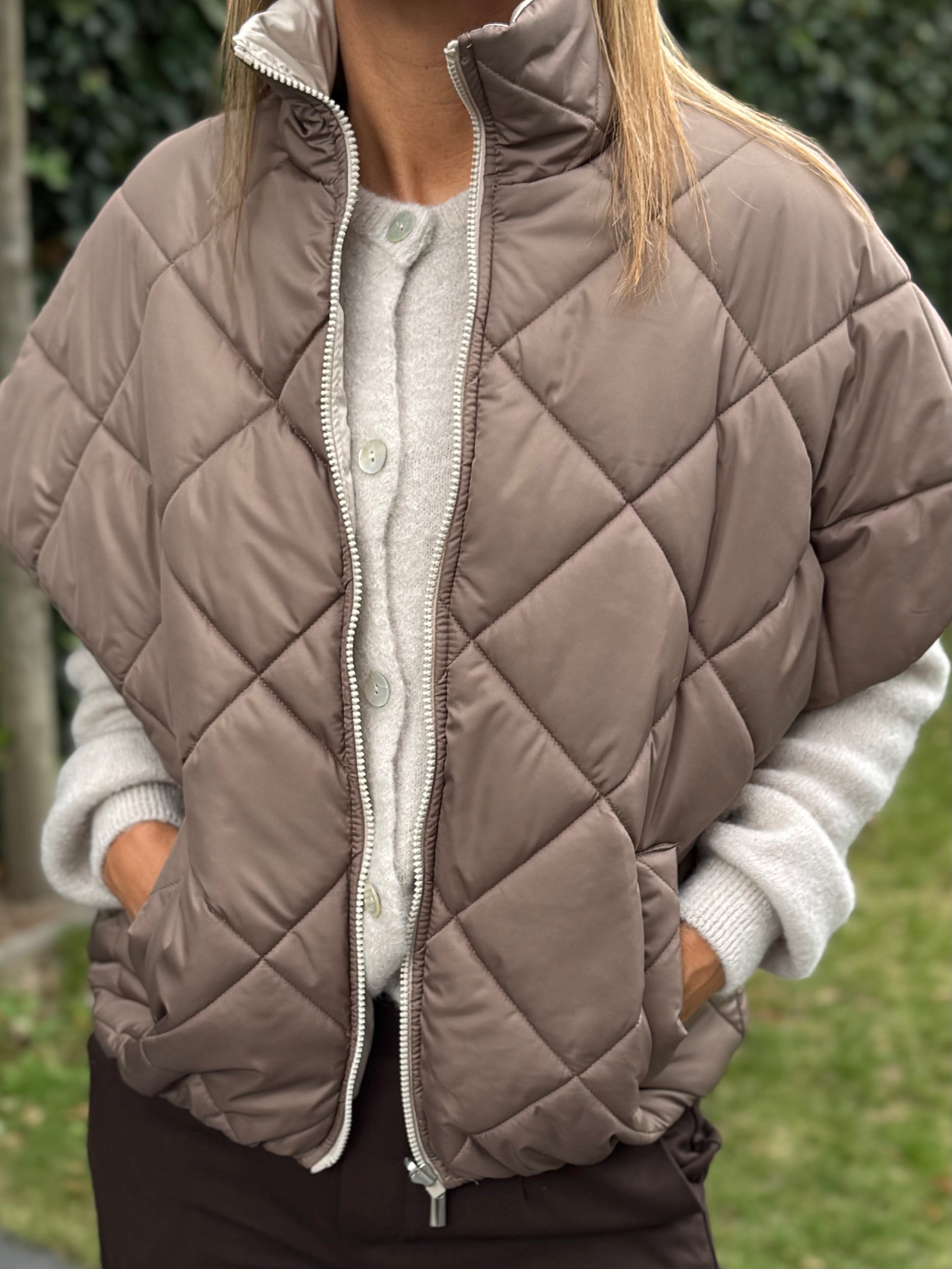Ruim vallende gewatteerde bodywarmer- 2 kanten draagbaar- Taupe-Ecru