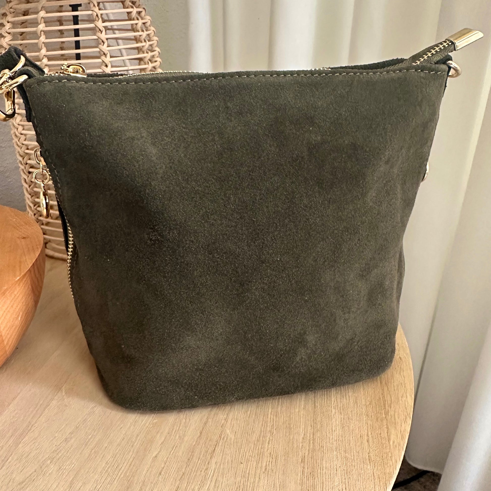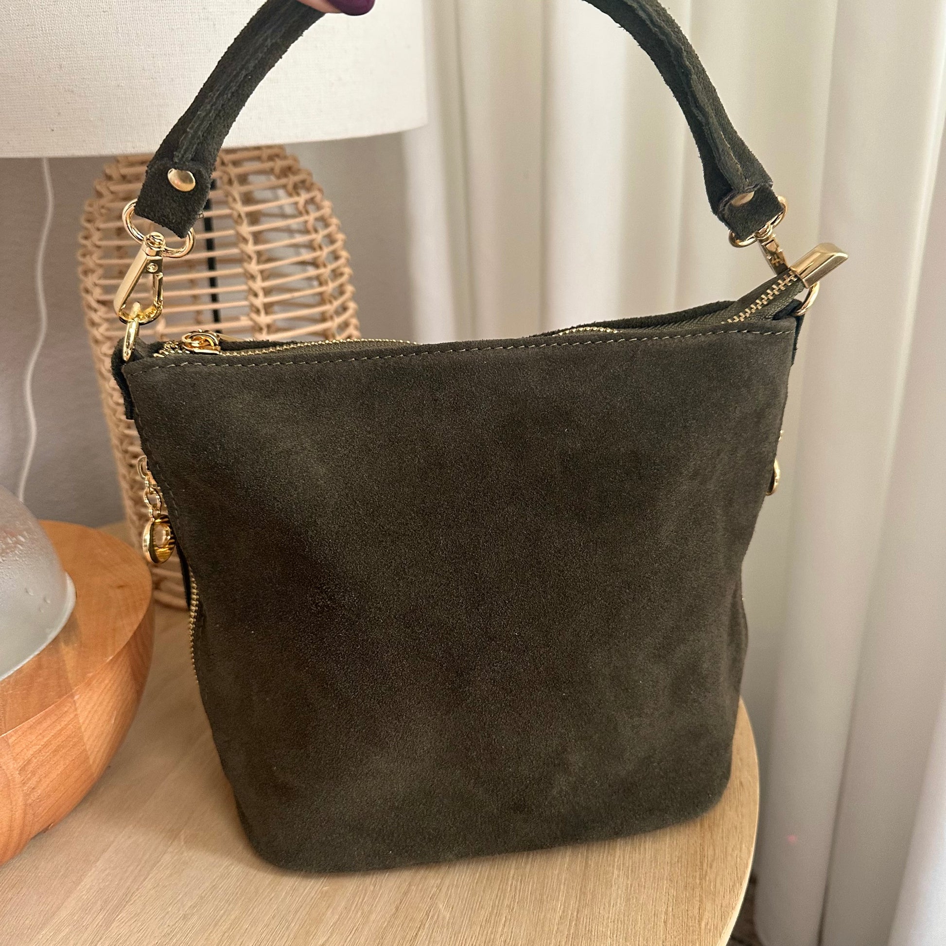 Er zit een kort hengsel aan en er zit een lang hengsel bij. Het korte hengsel kan verwijderd worden. Aan de kanten zitten sierritsen!